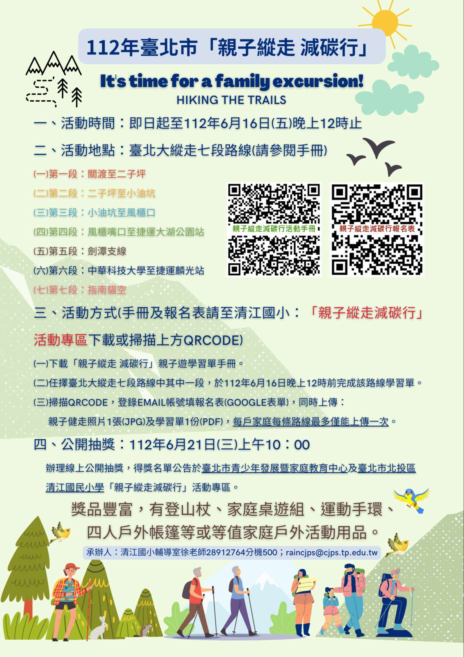 任擇臺北大縱走七段路線中其中一段,於112年6月16日(星期五)晚上12時前完成該路線學習單,並將基本資料、親子健走照片1張及學習單1份,拍照上傳至指定網址即可參加抽獎。