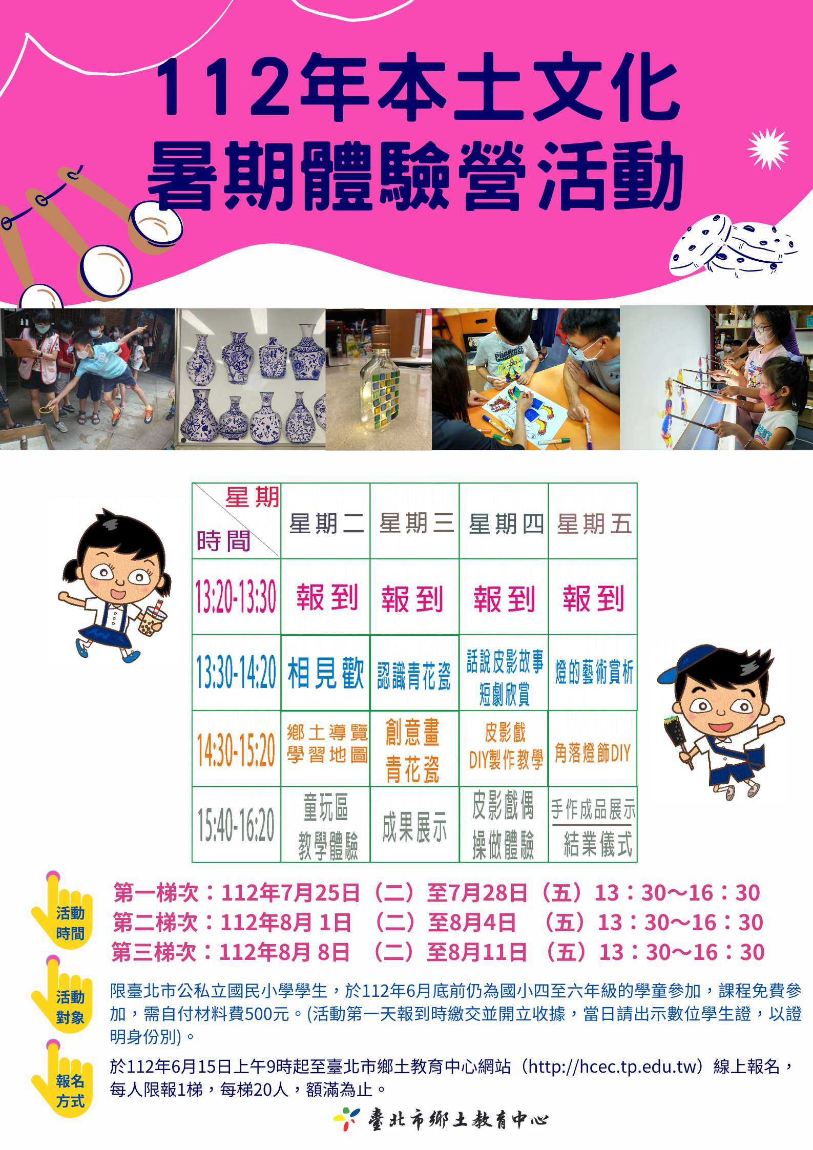 (二)報名時間:於112年6月15日上午9時起至臺北市鄉土教育 中心網站(http://hcec.tp.edu.tw)線上報名,每人限 報1梯,每梯20人,額滿為止。課程免費參加,需自付材 料費 500 元。