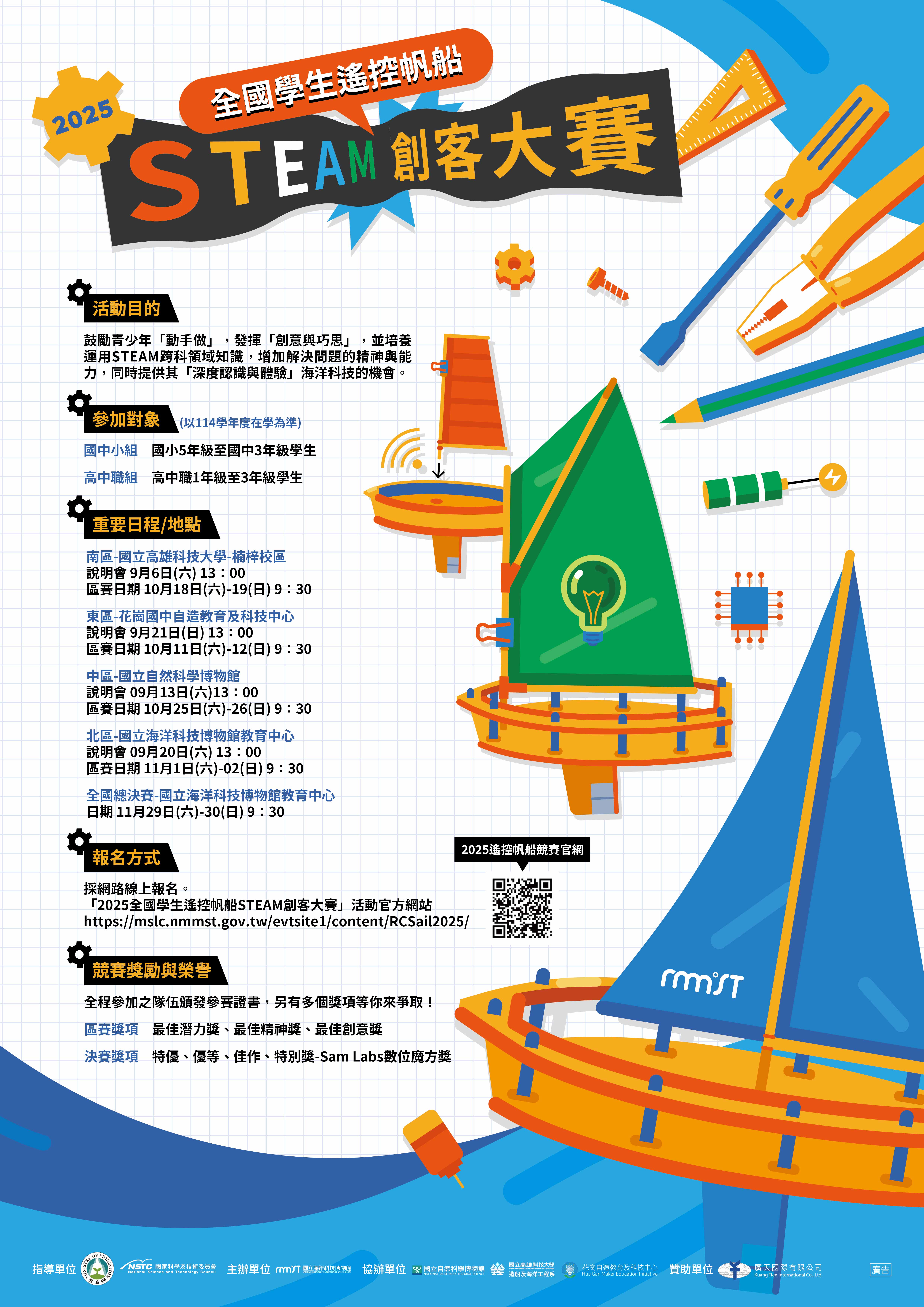 活動詳情與報名請參閱活動簡章,或至「2025全國學生遙控帆船STEAM創客大賽」活動官網
