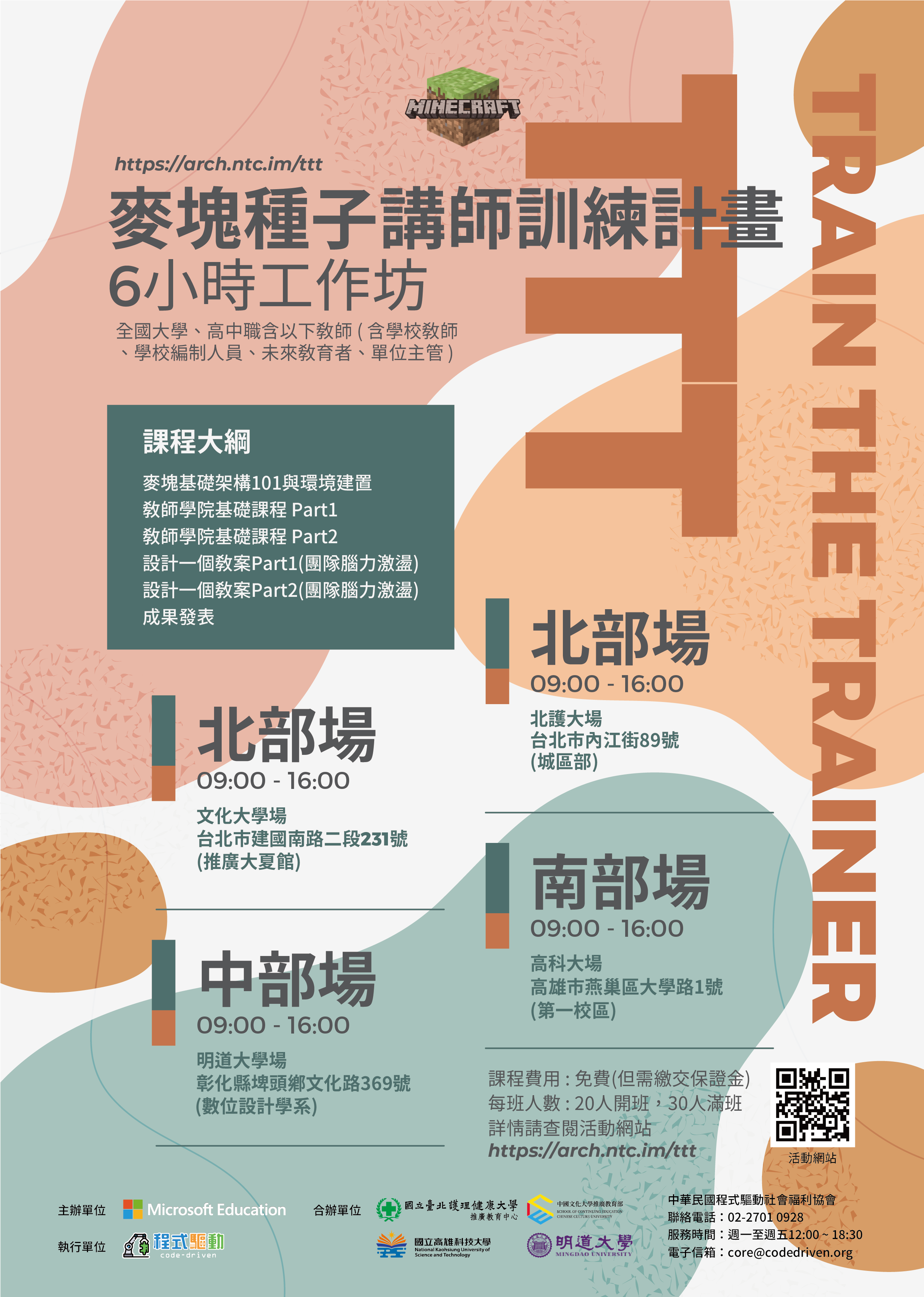 六、務必於課程網址: https://arch.ntc.im/ttt(另開新視窗) 與全國教師在職進修資訊網兩處皆報名,並完成繳交保證金$300元才算報名成功,全程參與者將核予【資訊非專】研習時數6小時。