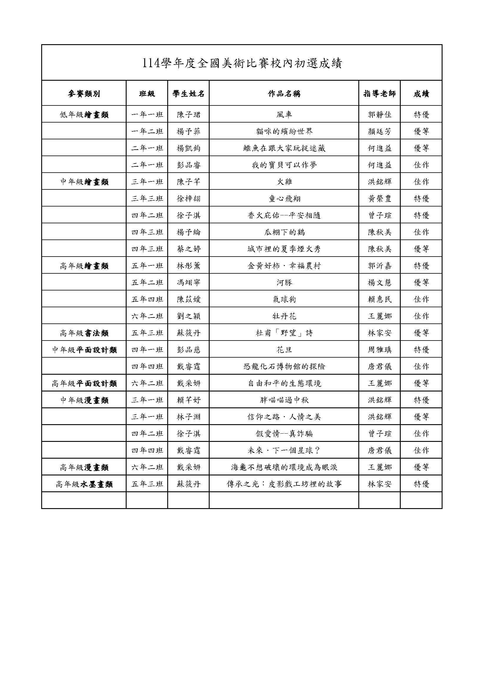 獲獎名單如附件恭喜獲獎同學將擇期於兒童朝會頒獎特優及優等之作品將擇優送件參加臺北市美術比賽南區評選